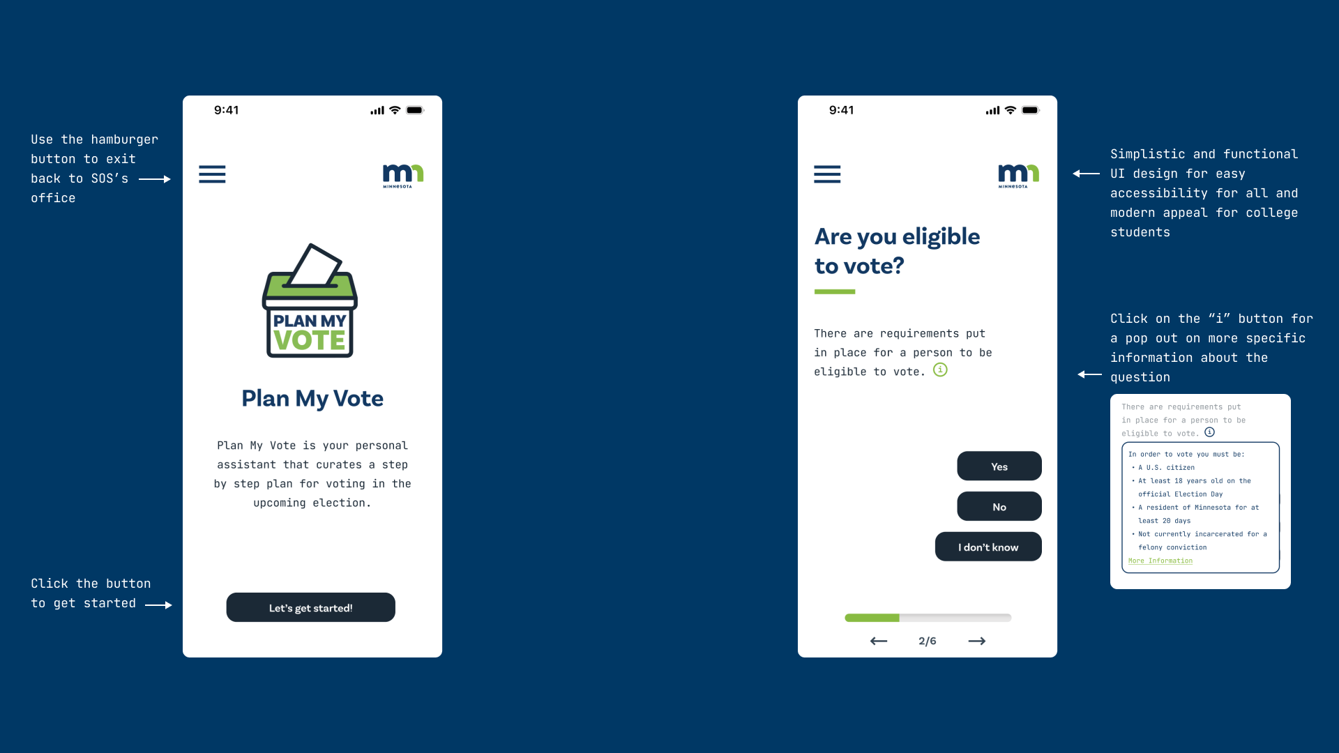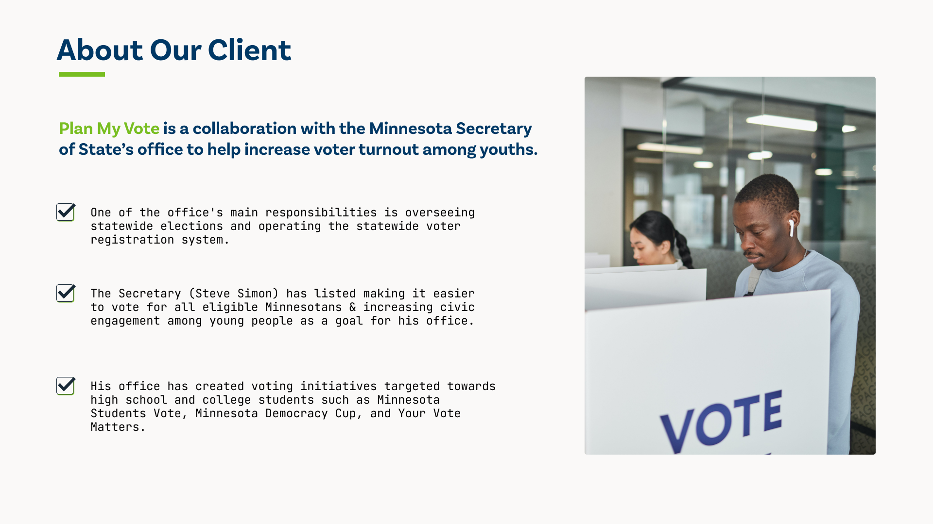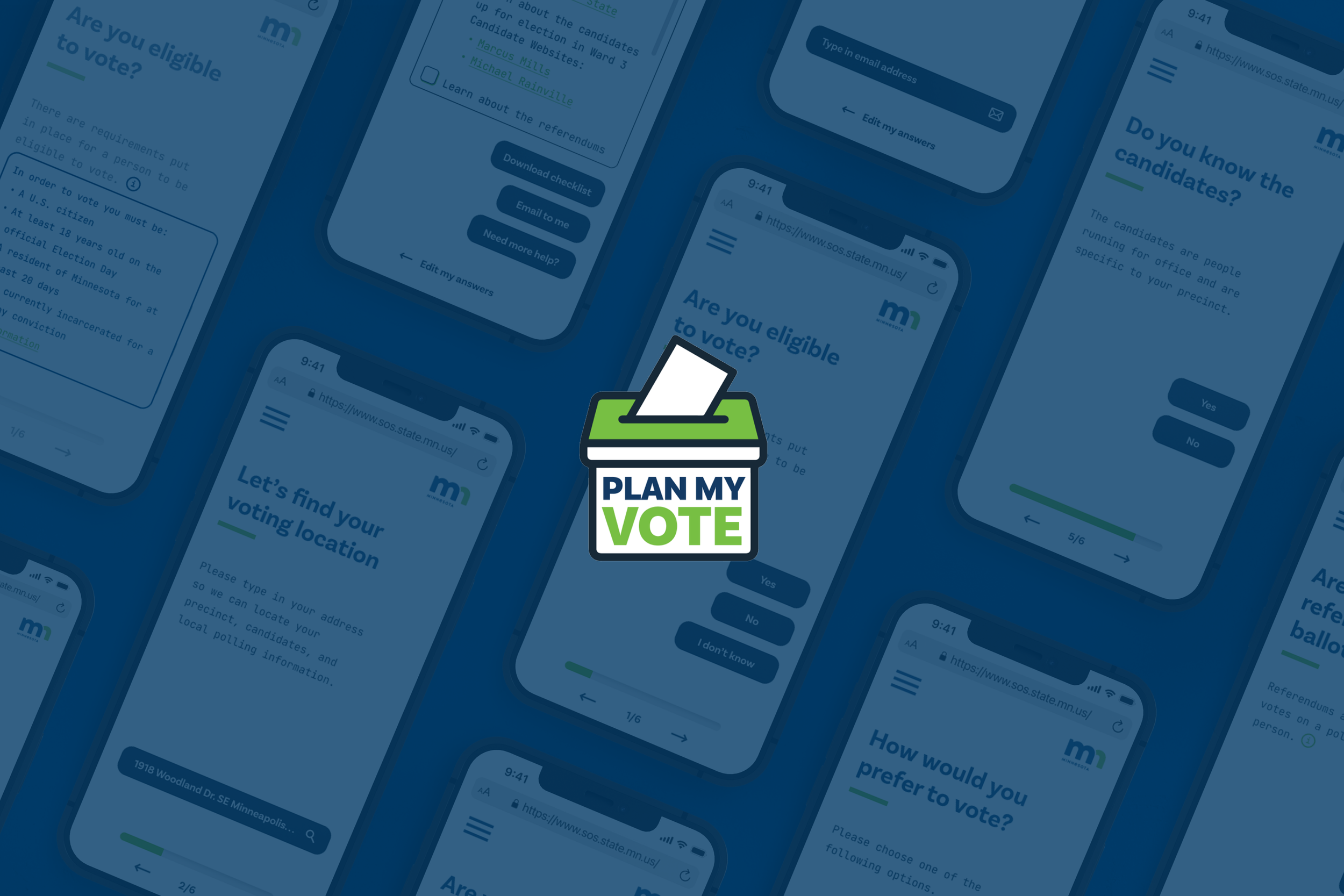 Plan My Vote is a personalized action plan for those confused and overwhelmed by the voting process. It is an online questionnaire fully integrated into the Secretary of State's website to increase youth voter turnout. Educating and empowering people to vote by ensuring they have all steps completed of the process when election day arrives.
