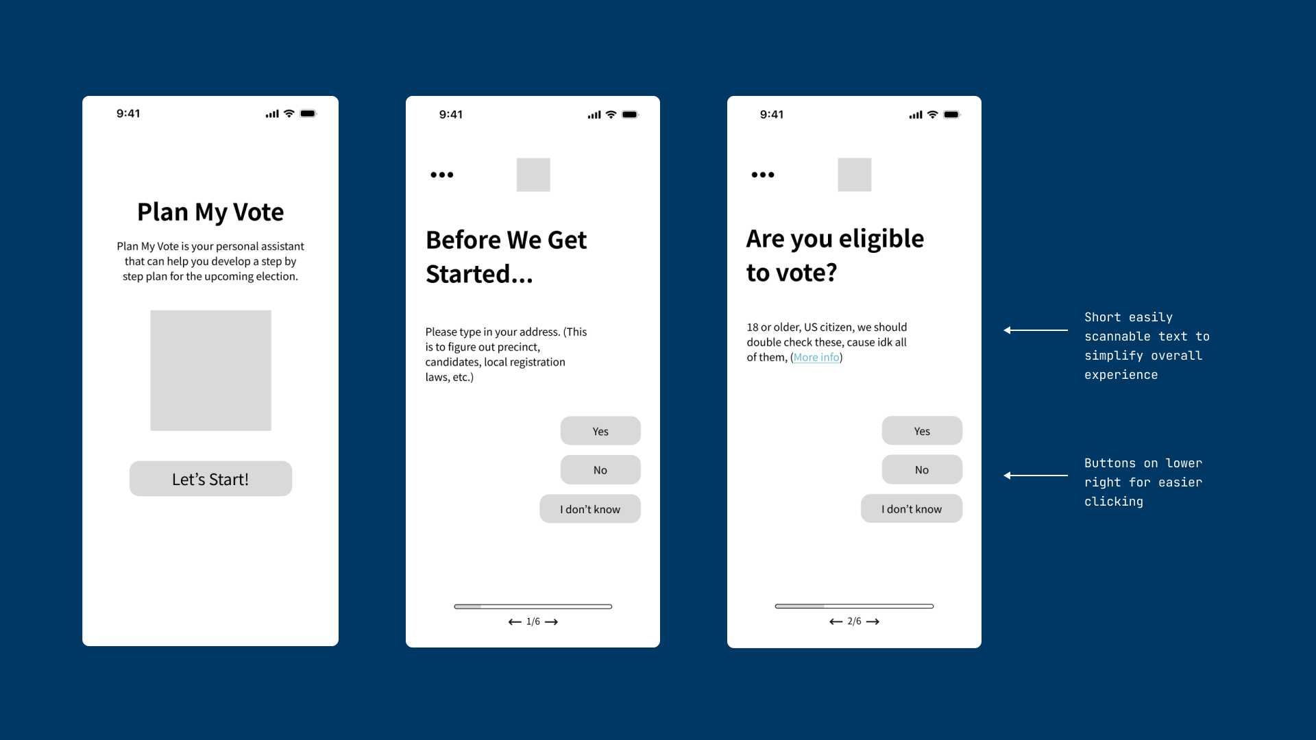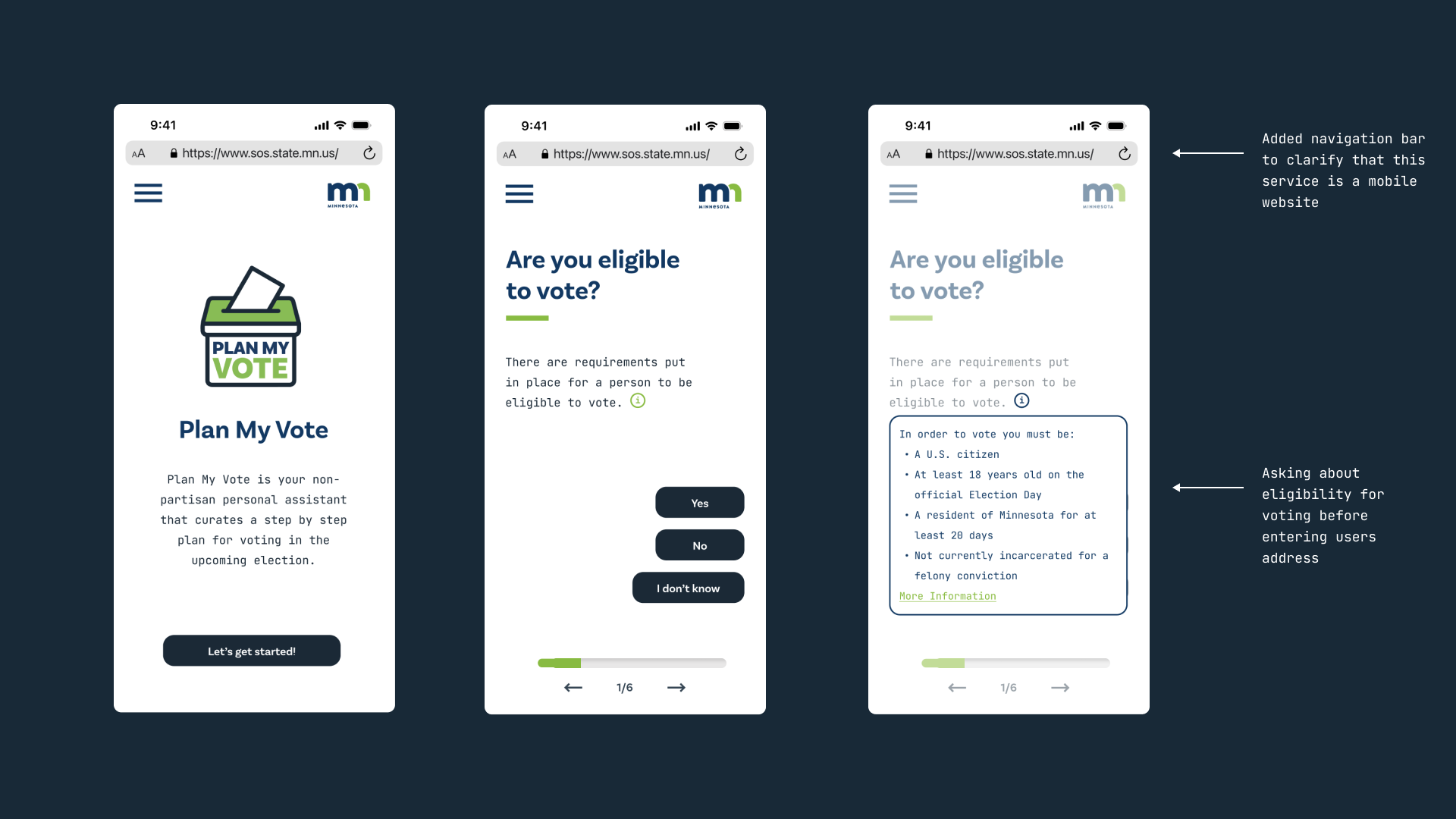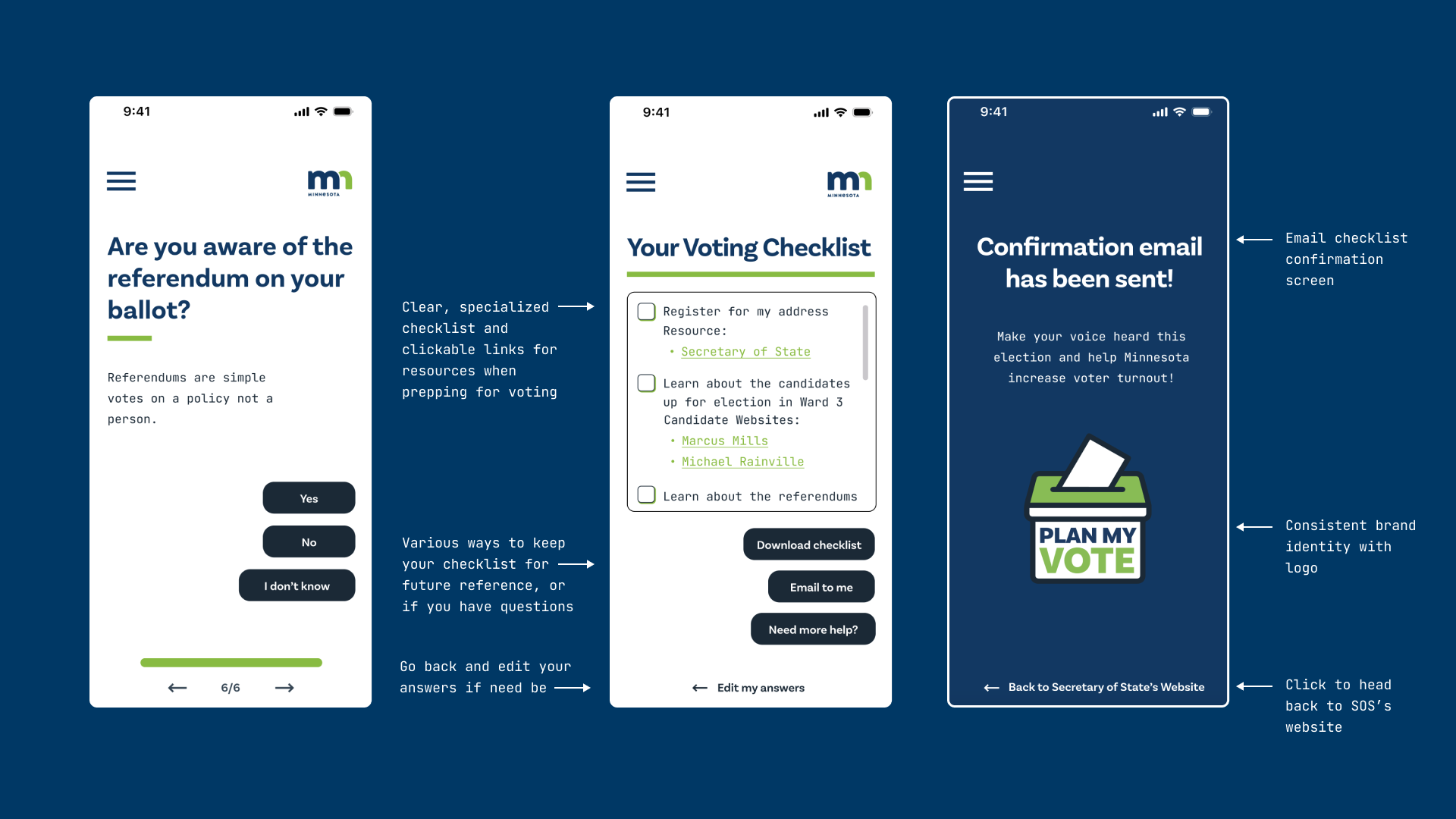 Plan My Vote is a personalized action plan for those confused and overwhelmed by the voting process. It is an online questionnaire fully integrated into the Secretary of State's website to increase youth voter turnout. Educating and empowering people to vote by ensuring they have all steps completed of the process when election day arrives.
