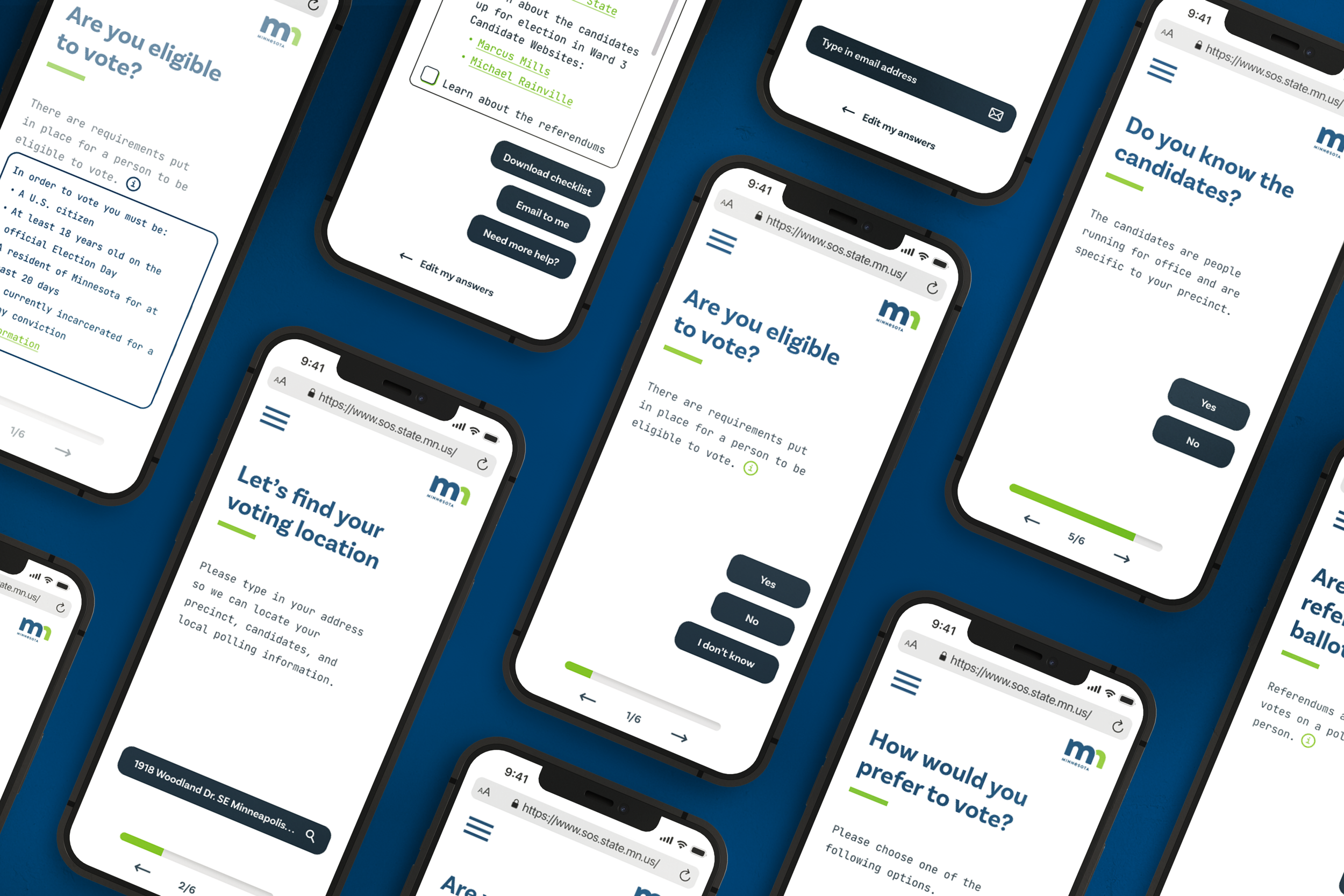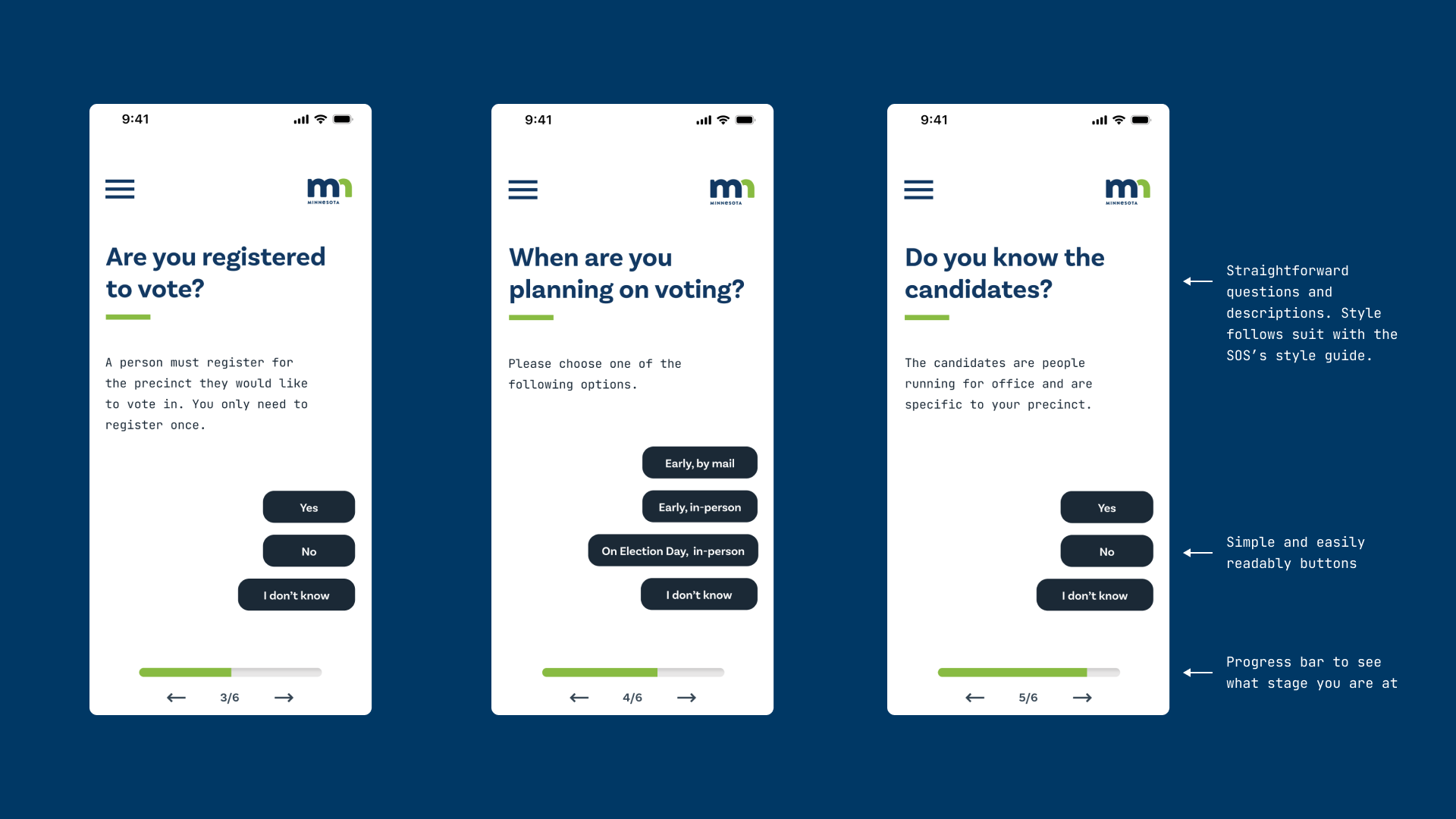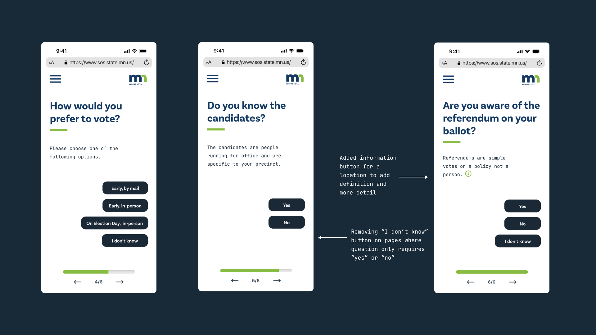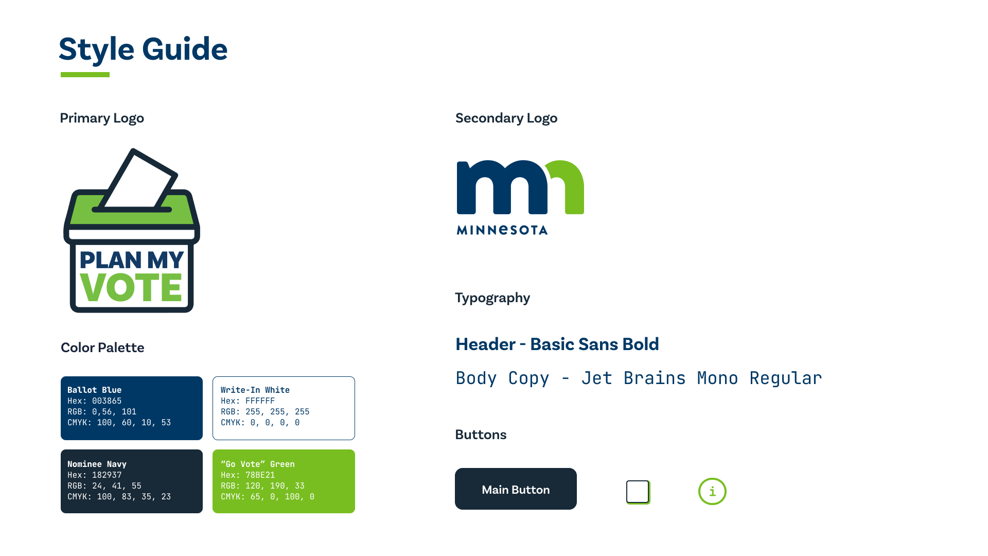 Before moving on to the Hi-Fi prototype, our team created the visual identity of the questionnaire. Since the Minnesota Secretary of State is our client for the program, we borrowed their “Minnesota Blue” and “Minnesota Green” with new names and a navy color for buttons and text for high contrast plus readability. Utilizing their colors allowed for a cohesive transition across the MN Secretary of State's website.