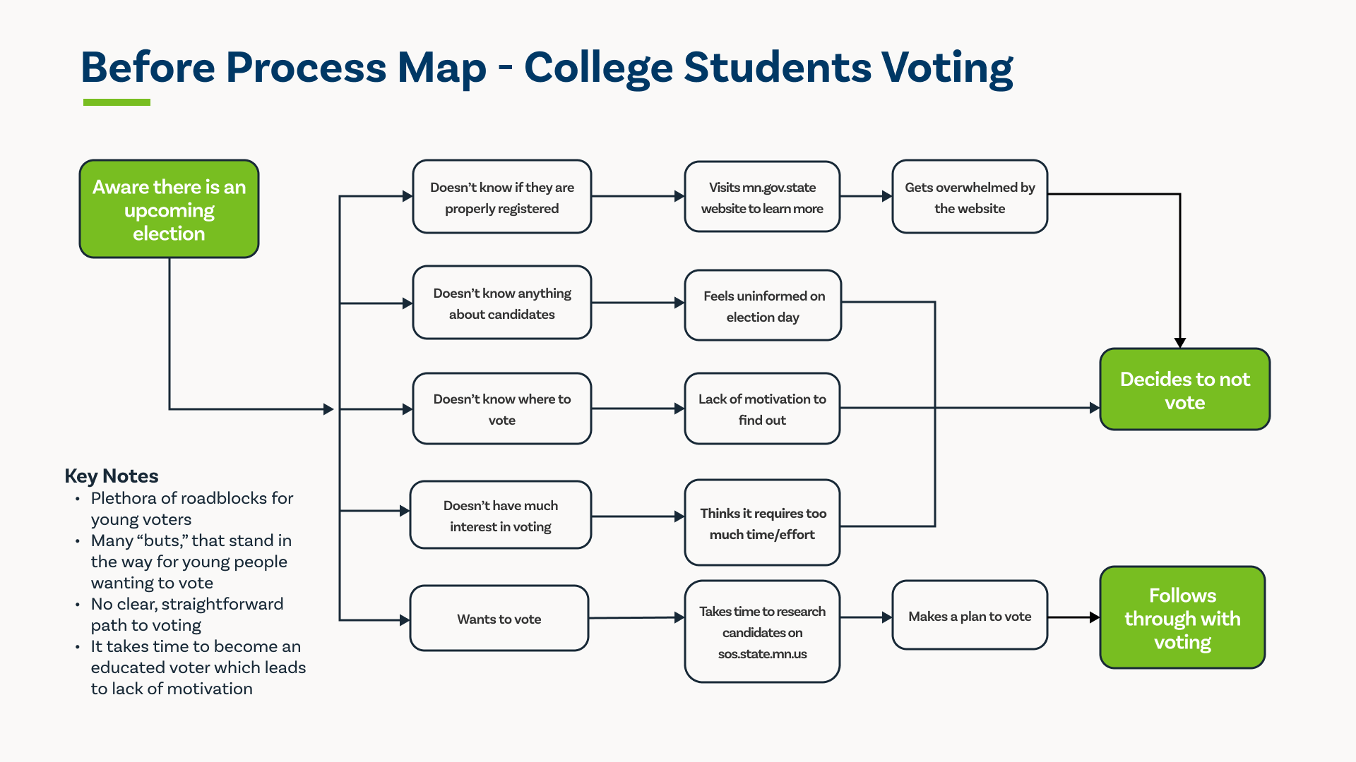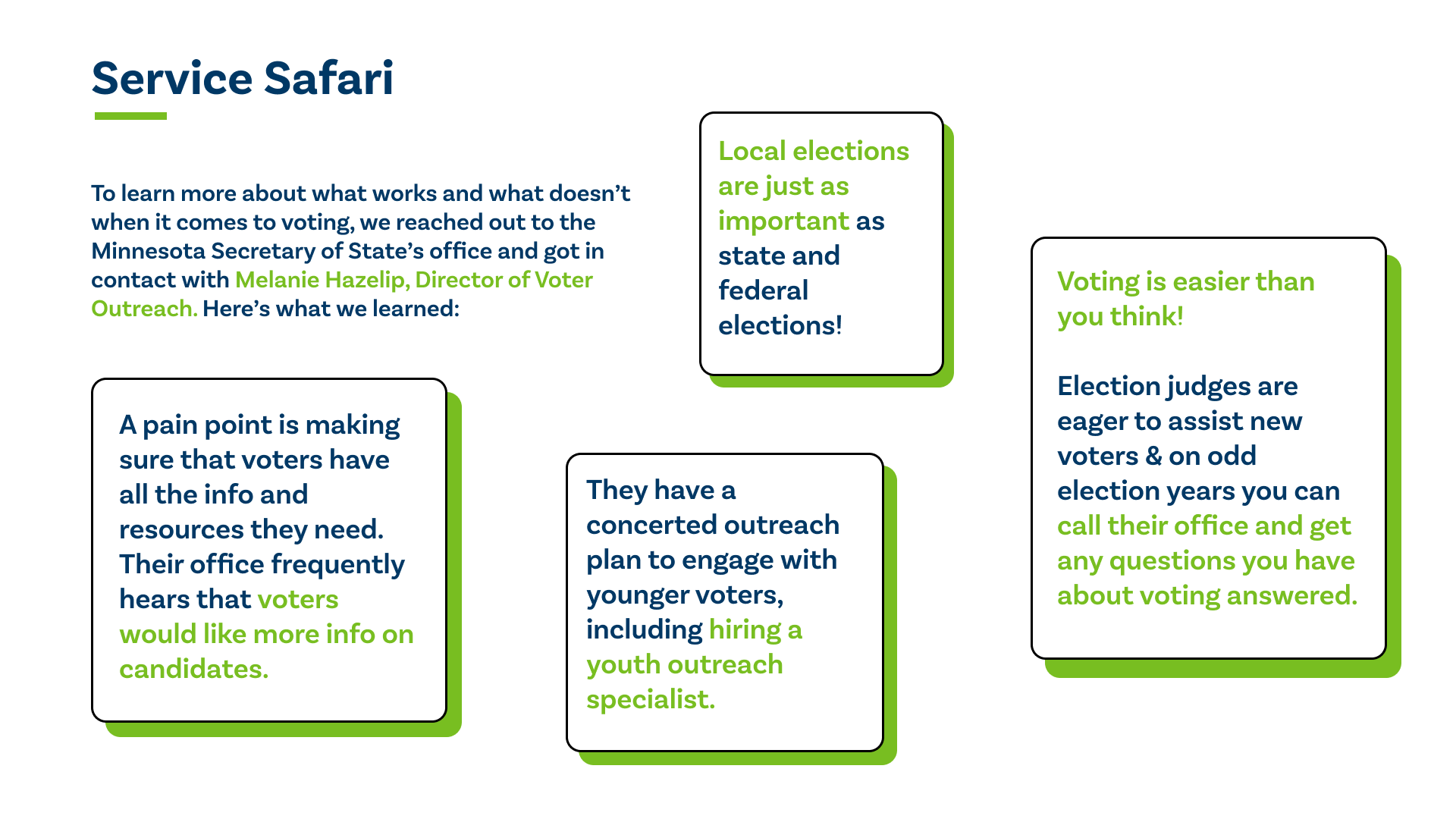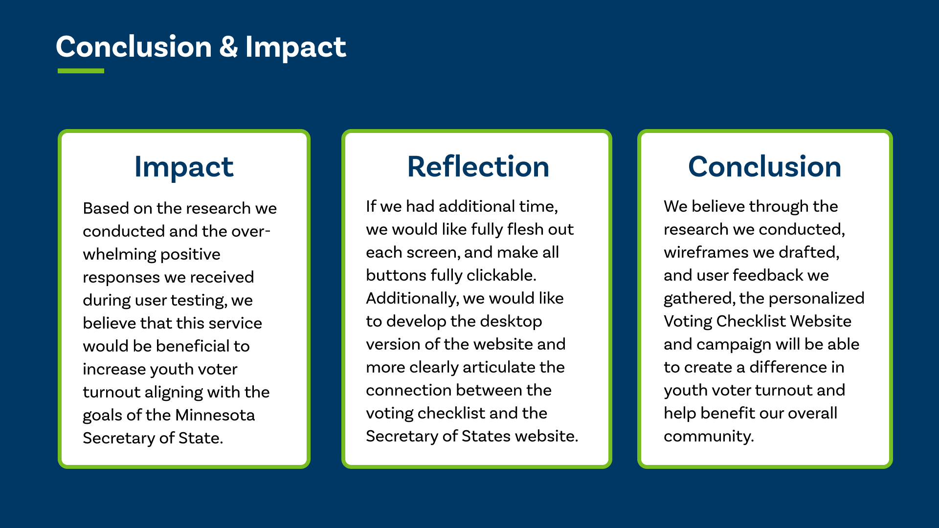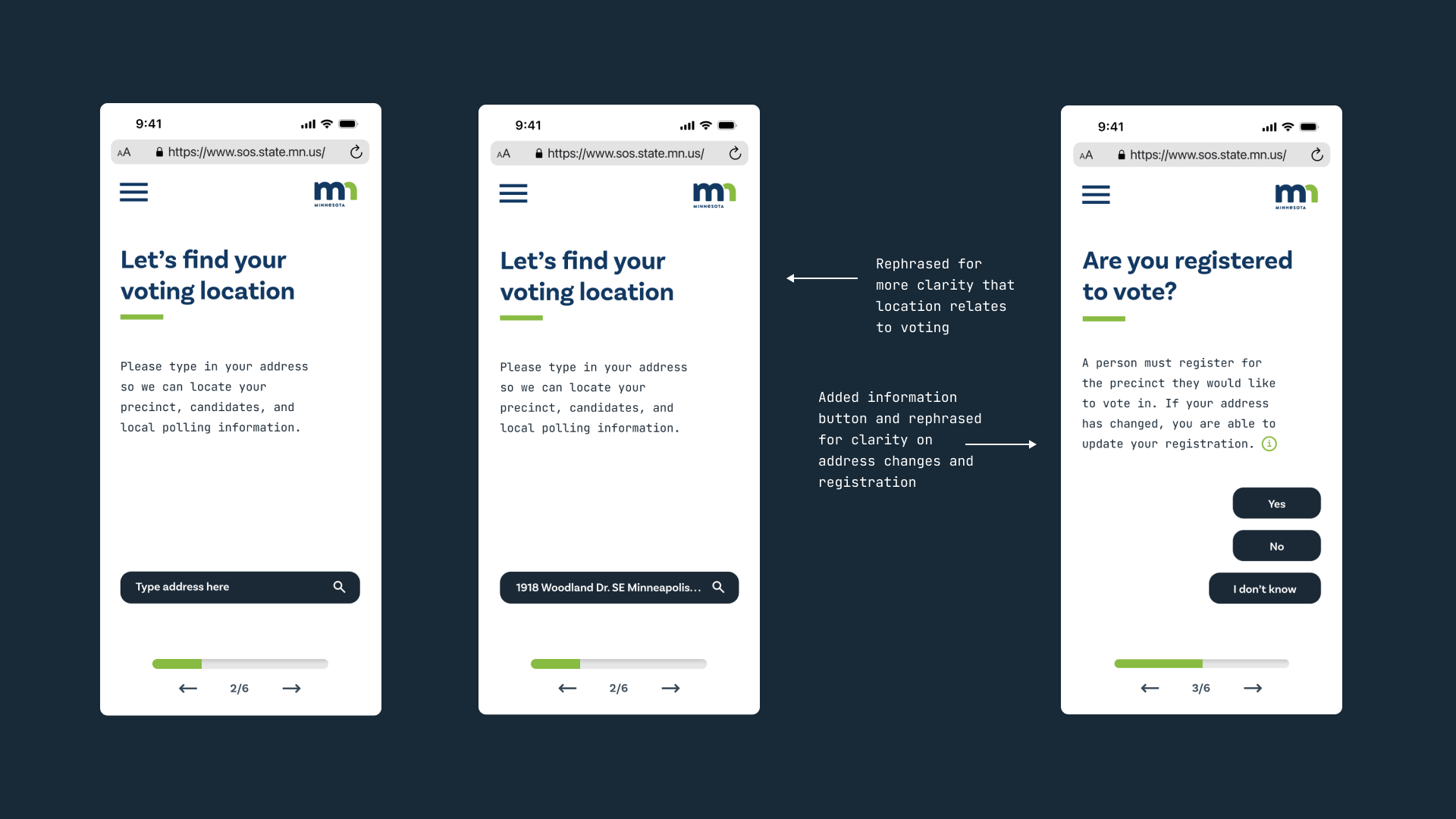 Before moving on to the Hi-Fi prototype, our team created the visual identity of the questionnaire. Since the Minnesota Secretary of State is our client for the program, we borrowed their “Minnesota Blue” and “Minnesota Green” with new names and a navy color for buttons and text for high contrast plus readability. Utilizing their colors allowed for a cohesive transition across the MN Secretary of State's website.