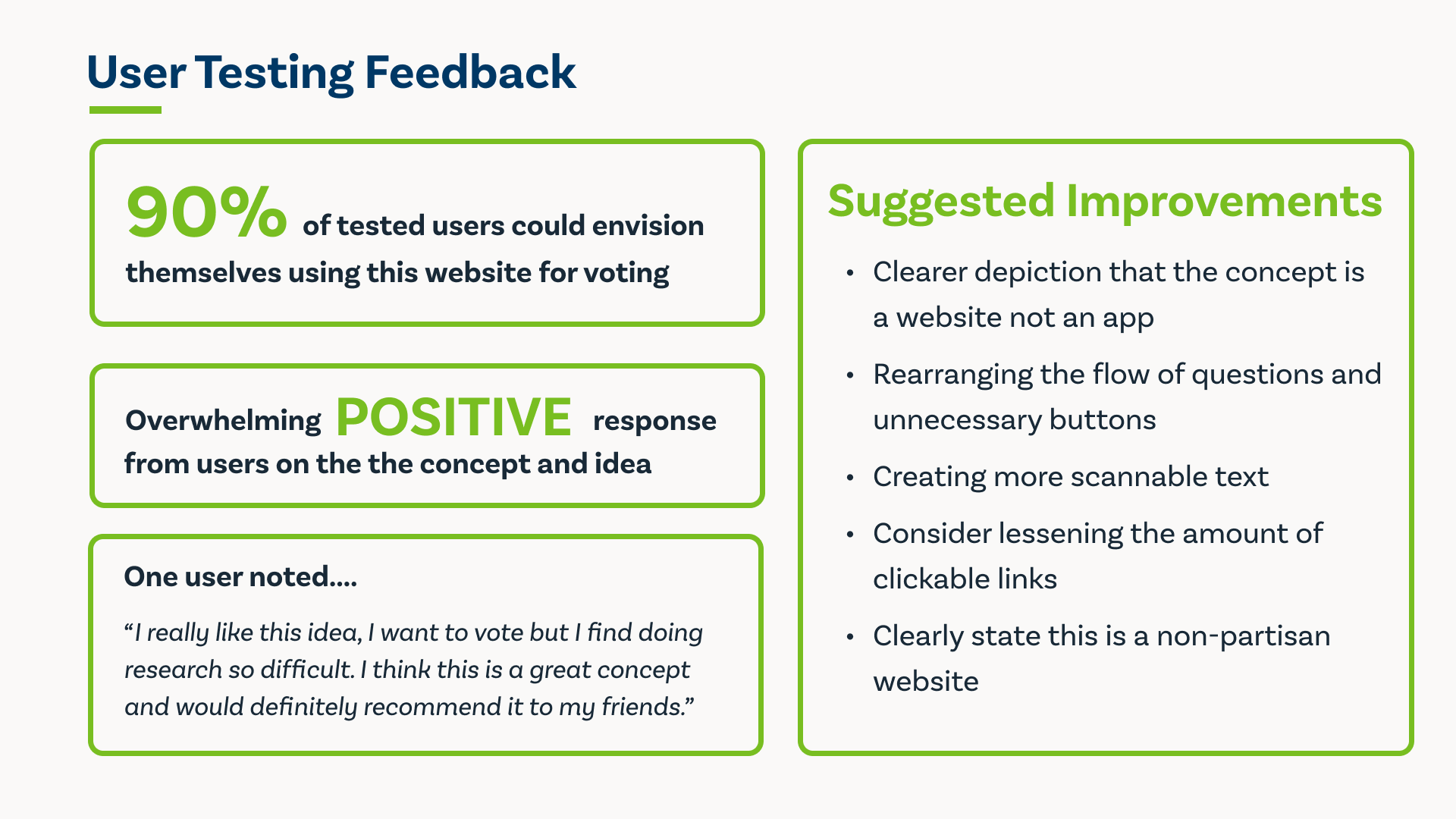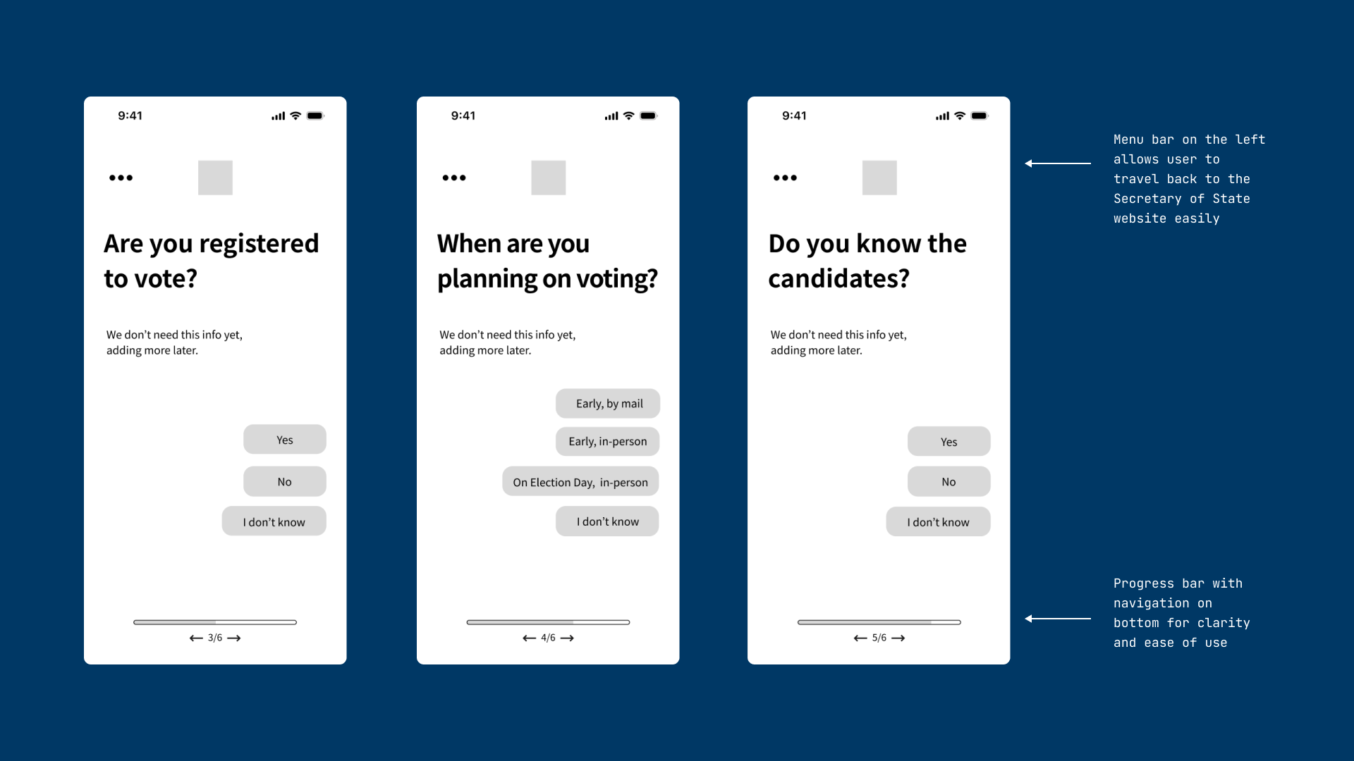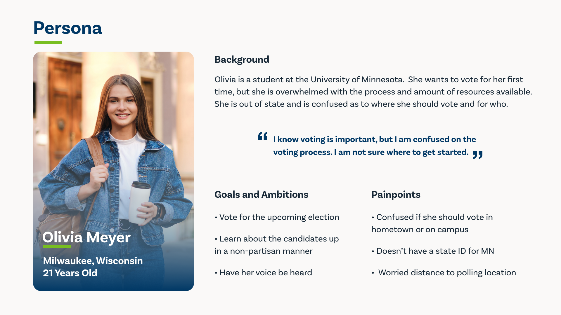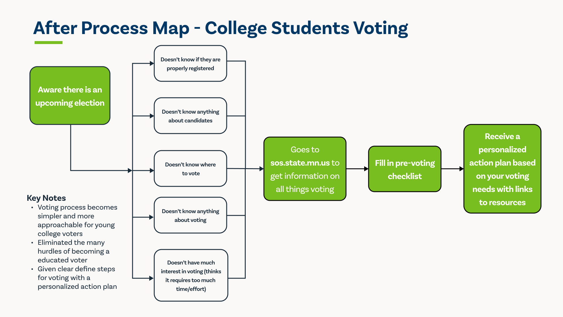 Before moving on to the Hi-Fi prototype, our team created the visual identity of the questionnaire. Since the Minnesota Secretary of State is our client for the program, we borrowed their “Minnesota Blue” and “Minnesota Green” with new names and a navy color for buttons and text for high contrast plus readability. Utilizing their colors allowed for a cohesive transition across the MN Secretary of State's website.