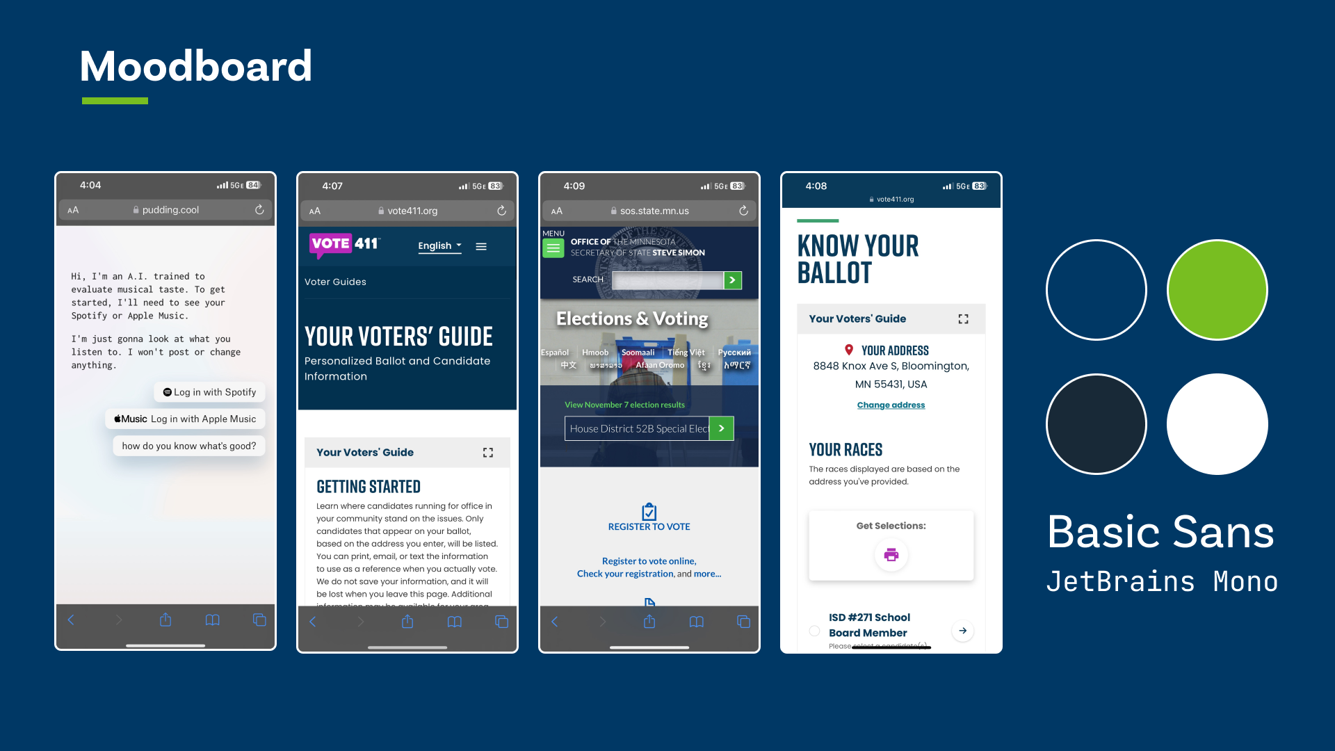 The questionnaire is meant to mimic a “chatbot” you might encounter on the Internet. We wanted the service to feel like a personal assistant that is helping you through the voting process. You will see below on our moodboard how the visual inspiration and use of colors translated into the style guide and final prototype.