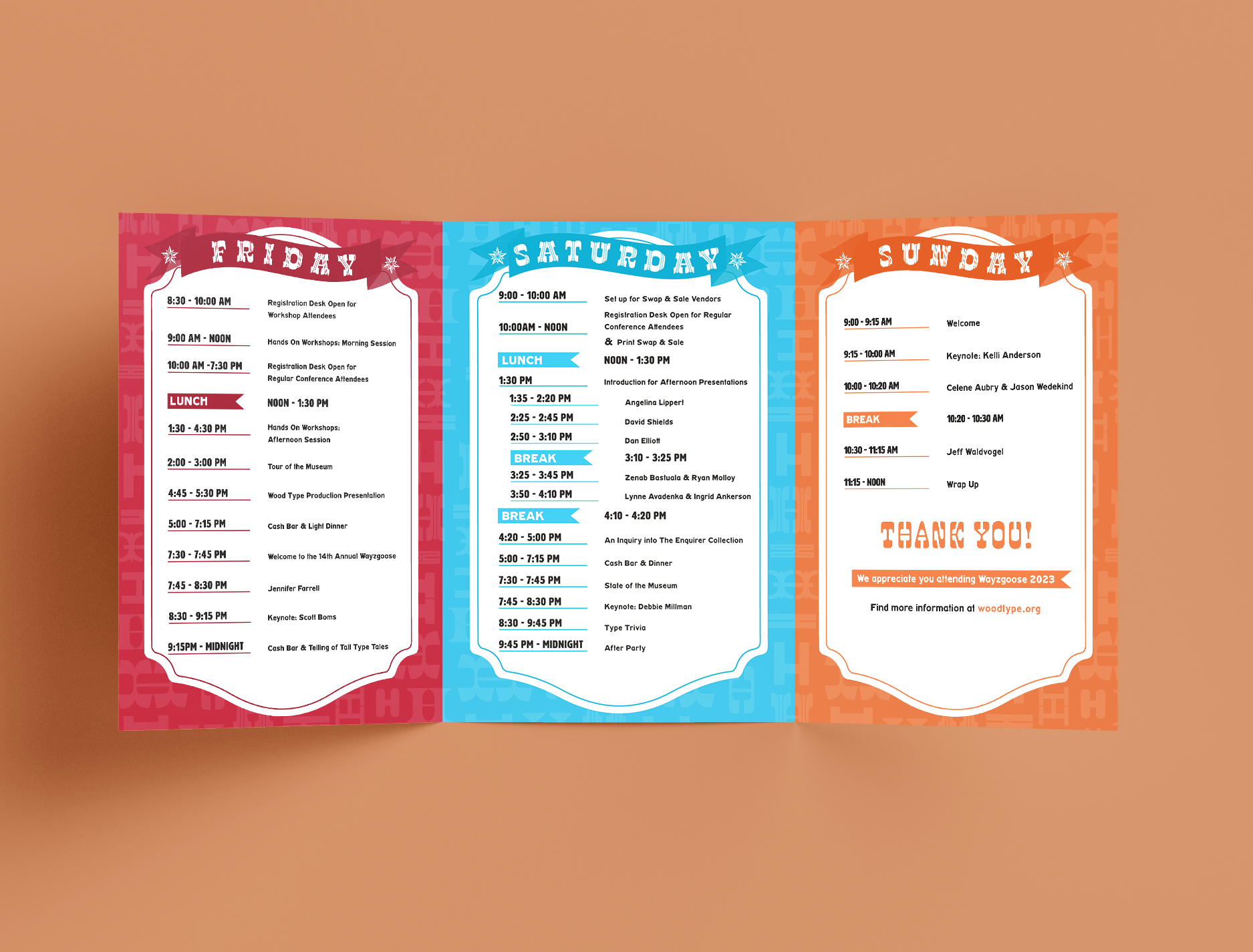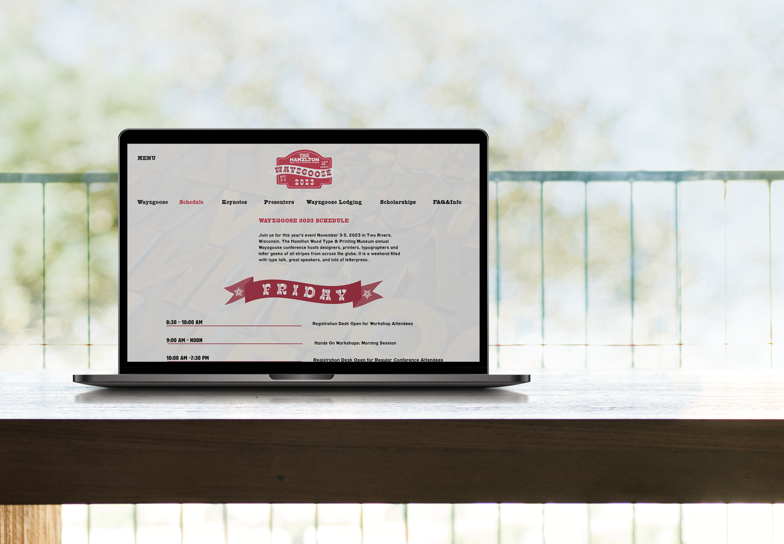 The annual Wayzgoose is a typography conference hosted at the Hamilton Wood Type & Printing Museum in Two Rivers, Wisconsin. The goal was to craft an identity that honors the museum's rich history as the home of the world's largest wood type collection. Characteristics of traditional wood type allowed me to draw inspiration from the rustic charm of old saloons and Western aesthetics.